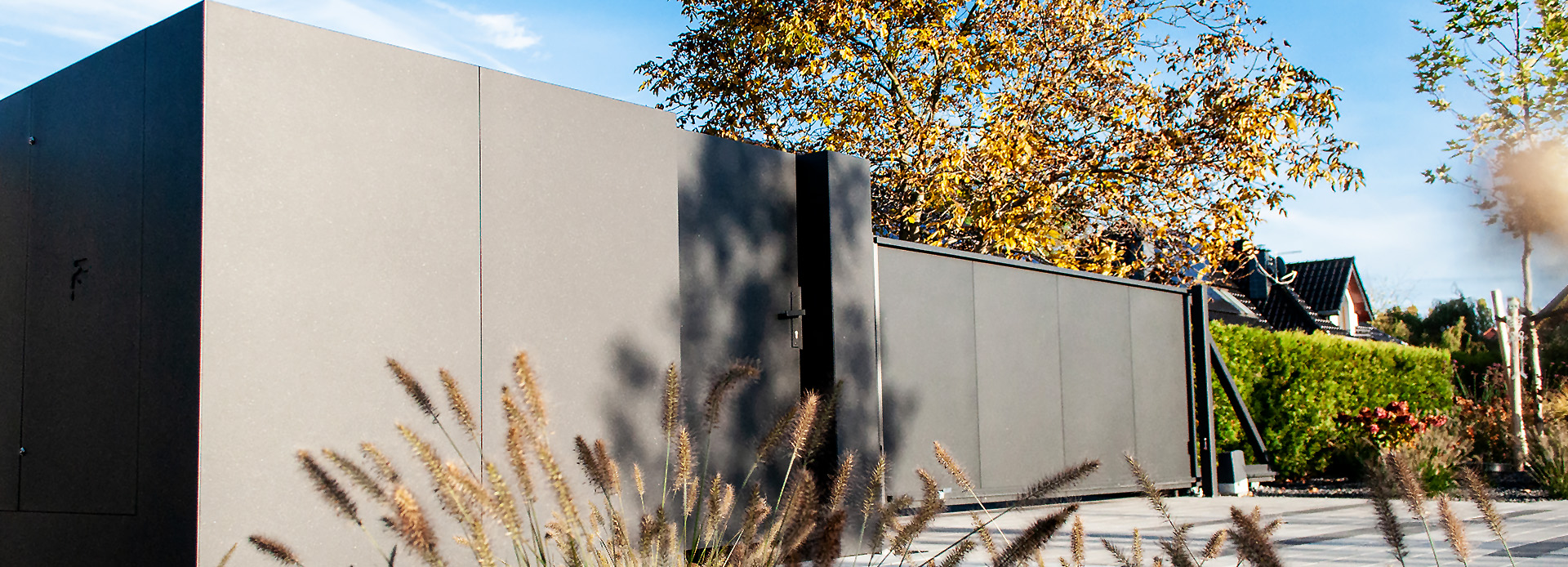 Die Schiebetor ist aus beidseitigem 3-mm-Aluminiumblech gefertigt. Die Schiene besteht aus 80 oder 120 mm dickem Stahl, je nach Größe des Tores, optional auch aus Aluminium.