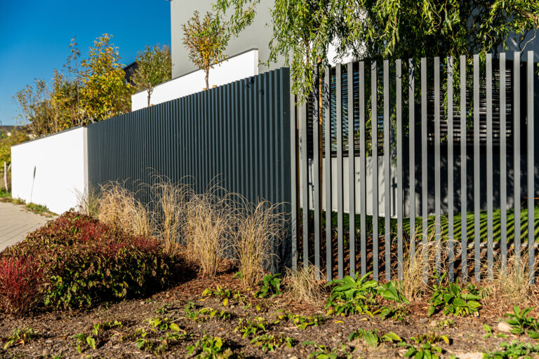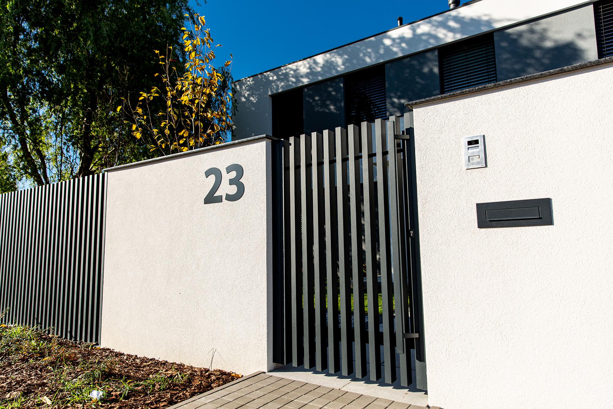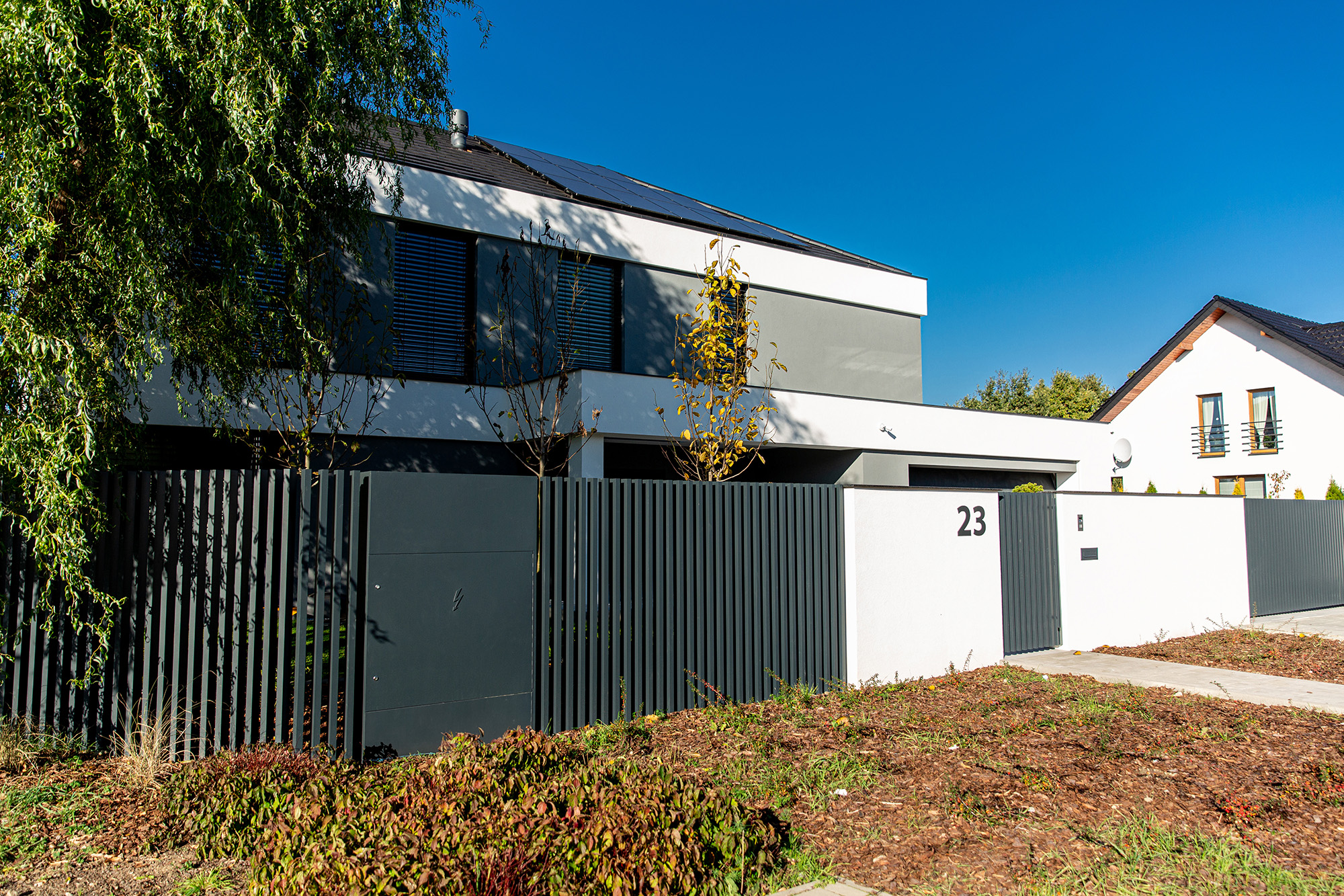Nowoczesne, minimalistyczne ogrodzenie pełne wykonane w całości z aluminium. Blacha 3 lub 4mm w zależności od wymiaru elementu, malowana proszkowo w dowolny kolor RAL. Brak widocznych mocowań, sprawia, że ogrodzenie prezentuje się wyjątkowo.