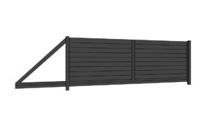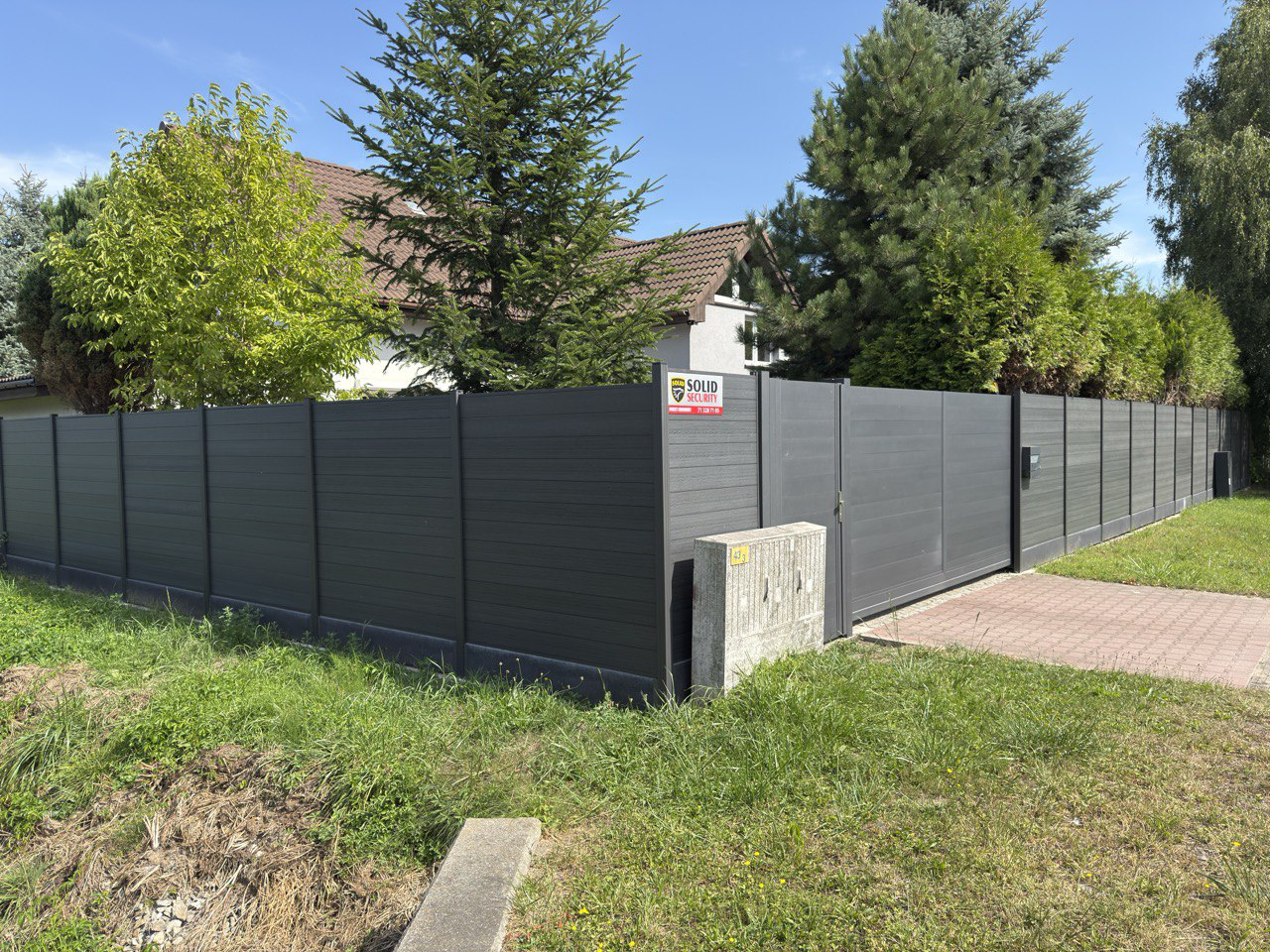 Front ogrodzenia został wykonany z przęseł kompozytowych, które uzupełnia aluminiowa brama przesuwna o szerokości 4 metrów oraz furtka – model SOLID w kolorze RAL 7016 SM.