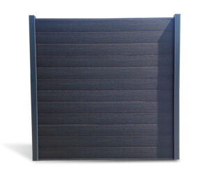 Przęsła wypełniono deską WPC premium z widoczną strukturą słojów w kolorze antracyt, natomiast słupy, w których osadzono deski, wykonano z aluminium w tym samym odcieniu, z delikatną strukturą powierzchni.